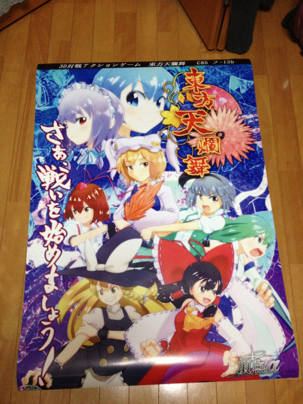 すっごく遅くなったけど頂点αのC85参加決定のお知らせです! 東方天爛舞の完成版を頒布する予定!ゲームがどういうものか気になる方はプロフィール欄の一番下にあるリンクから体験版をDLして是非遊んでみてくださいね! 場所は 二日目 東地区 フ-13bです!値段は1500円を予定しています。また、設定資料集的なものも頒布予定です! そして頂点αの場所は↓ このポスターが目印です!今までA4サイズの紙を切り貼りしていたものからグレードアップしました。完成版くらいはちゃんとしたポスターにしたいと最初の体験版を頒布していた時から思っていたんですよ! というわけで印刷会社さんに頼んでいたものでポスターが真っ先に届いたので報告までに。 ゲームと資料集も届き次第また記事にしたいと思います~。 PR |